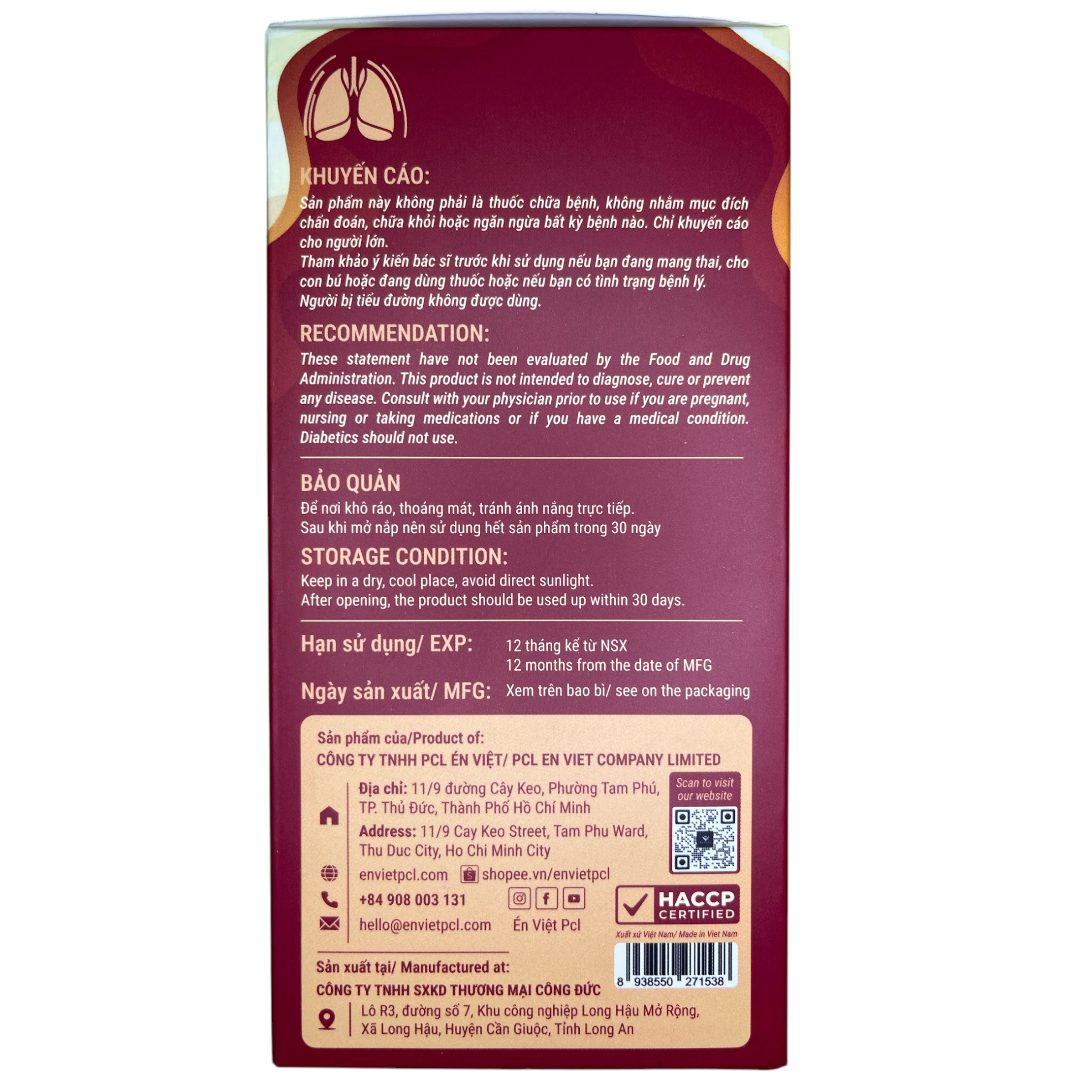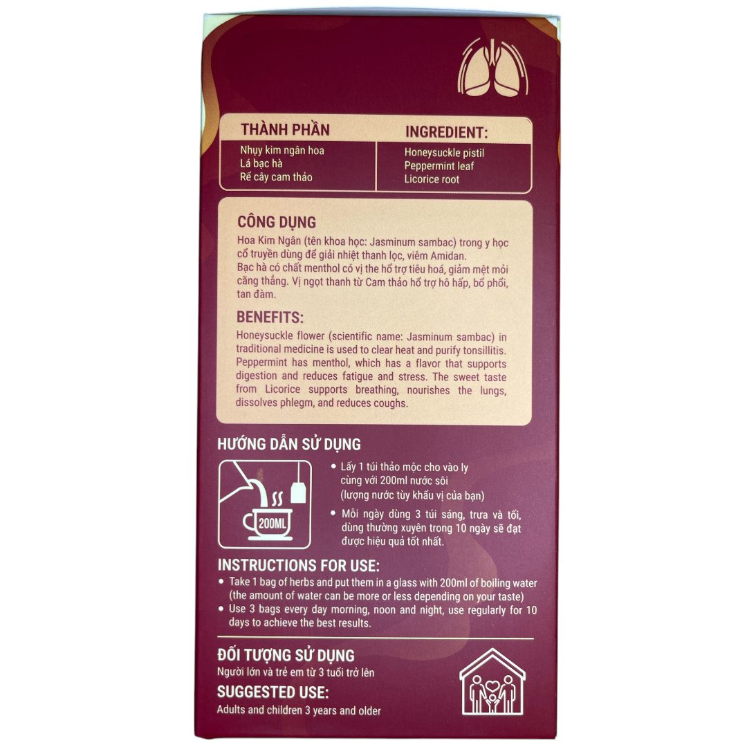 CÔNG DỤNG: Thảo Mộc THANH PHỔI giúp hỗ trợ bảo vệ kháng niêm vòm họng. Hỗ trợ thanh lọc phổi giúp phổi khoẻ mạnh hơn mỗi ngày, lọc những khói bụi tác nhân từ môi trường ô nhiễm và ảnh hưởng từ khí hậu chuyển mùa. THÔNG TIN VỀ SẢN PHẨM: – Thương hiệu: Công Ty TNHH PCL Én Việt – Nơi sản xuất: Việt Nam – Sản xuất tại: CÔNG TY TNHH SX KD TM CÔNG ĐỨC – Số: – Dạng bào chế: Dạng đóng gói túi lọc – Định lượng: 2 gr / 1 túi – Quy cách: Hộp 30 túi – Bảo quản: Nơi khô ráo, thoáng mát, tránh ánh nắng chiếu trực tiếp – Hạn sử dụng: 12 tháng kể từ ngày sản xuất. NSX và HSD xem trên bao bì. Dừng uống nếu mẫn cảm với một trong các thành phần của sản phẩm. – Được sản xuất trong nhà máy đạt chứng chỉ HACCP, tiêu chuẩn GMP và tiêu chuẩn ISO 22000:2005 được kiểm soát bởi Cục An Toàn Thực phẩm. – Được cấp phép lưu hành và được kiểm định khắt khe bởi Bộ y tế về chất lượng và mức độ an toàn trước khi đưa ra thị trường. 🌺THÀNH PHẦN: – Thảo Mộc THANH PHỔI được bào chế từ 3 vị thảo dược bao gồm: Kim Ngân Hoa, Bạc Hà, Cam Thảo. ĐỐI TƯỢNG SỬ DỤNG – Người lớn và trẻ em trên 3 tuổi bị ảnh hưởng từ dịch Covid19 – Người lớn và trẻ em trên 3 tuổi thường xuyên di chuyển những nơi có khói bụi, môi trường không khí bị ô nhiễm – Người lớn và trẻ em trên 3 tuổi bị ảnh hưởng bởi khói thuốc thụ động – Người lớn và trẻ em trên 3 tuổi ở những vùng khí hậu chuyển mùa, dễ gây ra chịu chứng ho khang, cảm cúm. – Thảo mộc hổ trợ Thanh Phổi nên dùng trước khi đi ngủ sẽ rất tốt cho hơi thở dễ ngủ hơn, giảm trằn trọc mất ngủ.
